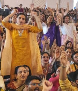On the third day of the seven-day Srimad Bhagwat Katha by Pundarik Goswami in Chandigarh, the entire pandal appeared immersed in the divine nectar (*Rasa*) of Radha Raman. The entire venue vibrated with energy as the crowd swayed to the chanting of the Mahamantra.