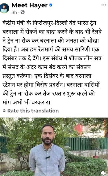 संगरूर बरनाला के सांसद गुरमीत सिंह मीत हेयर ने मीडिया से बात करते कहा कि वंदे भारत का बरनाला में प्रति चक्र ठहराव करने के लिए केंद्रीय मंत्री ने जो वादा किया वह धोखा पूर्ण था।उन्होंने रेलवे को 1 दिसंबर तक का अल्टीमेटम दिया है। उसके तुरंत बाद बरनाला स्टेशन पर विरोध प्रदर्शन होगा। मीत हेयर ने कहा कि बरनाला निवासियों की हाई-स्पीड रेल की मांग लंबे समय से है।