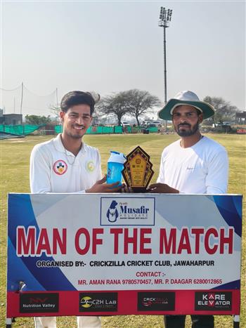 एम.एम. क्रिकेट अकादमी, अंबाला ने सनराइज क्रिकेट अकादमी, जीरकपुर को 3 विकेट से हराकर ट्राई-सिटी चंडीगढ़ के क्रिक जिला क्रिकेट ग्राउंड पर खेले गए चौथे आर.पी. सिंह मेमोरियल अंडर-23 क्रिकेट टूर्नामेंट का अपना लीग मैच जीत लिया। चौथे उत्तर क्षेत्र आर.पी. सिंह मेमोरियल अंडर-23 क्रिकेट टूर्नामेंट का आयोजन हरियाणा स्पोर्ट्स वेलफेयर एसोसिएशन (पंजीकृत) द्वारा किया जा रहा है। एम.एम.क्रिकेट अकादमी, अंबाला के प्रशांत को प्लेयर ऑफ द मैच घोषित किया गया।