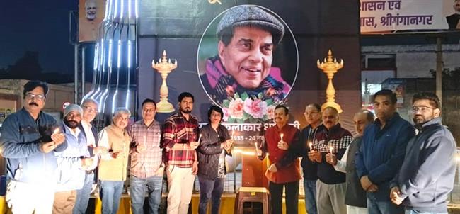 RD Burman Fans Club Sriganganagar organized an emotional tribute program on the demise of renowned Bollywood actor Dharmendra at Sukhadia Circle, where a large number of people gathered and expressed their condolences remembering the late actor.