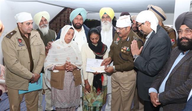 On the directions of Punjab Chief Minister Bhagwant Mann, Additional Director General of Police (ADGP) Law and Order Arpit Shukla on Saturday handed over two cheques of Rs 2 crores (Rs 1 crore each) to the family of slain Punjab Police Constable Mandeep Singh, who attained martyrdom in line of duty.